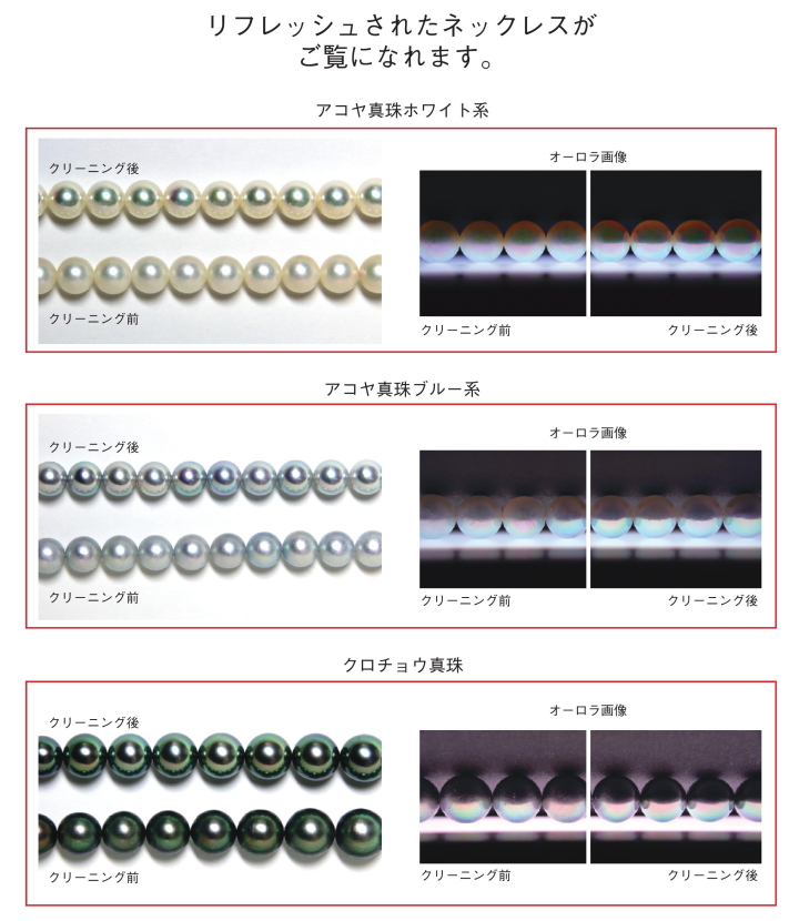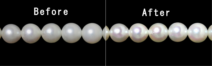 - 真珠内部の微小な隙間を化学物質で充填し経時による内部から発生する品質の低下を防ぐとともに、てり・透明感が向上します。