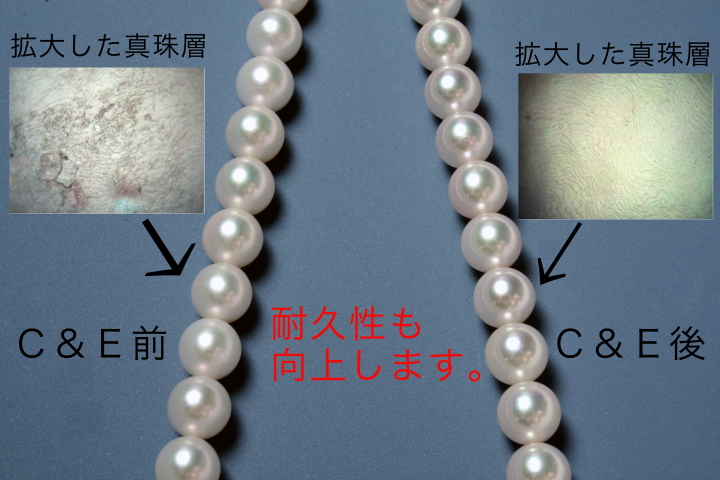 繊細な宝石である真珠の耐久性を向上させるために、真珠科学研究所が開発した技術「エステ(新マイクロパーマネント)」は、以下の効果が特徴です。