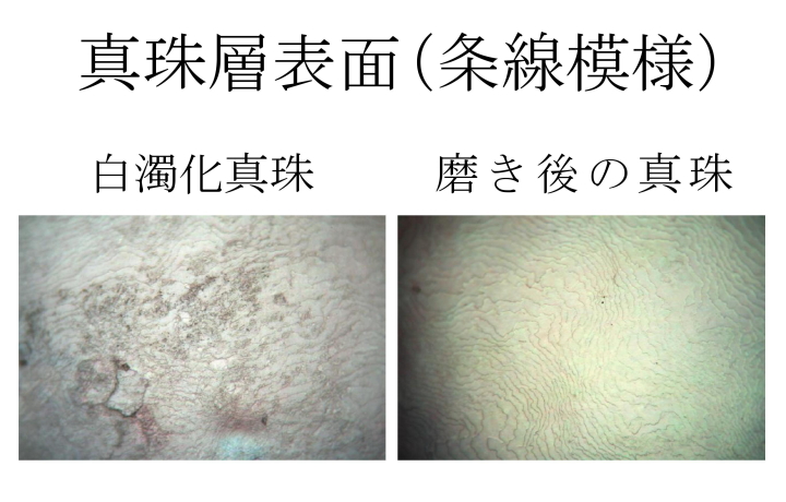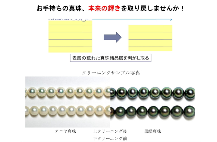 一般的に、良質のアコヤ真珠は結晶層1層あたり0.3~0.5㍈で千数百層以上から出来ているといわれています。そのことから溶けて出来た微細な凹凸のある真珠層数層だけを取り除くことで本来の輝きを取り戻すことができます。